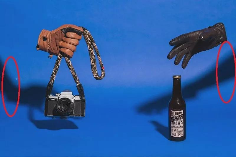如果沒有合適的細線或者懶得做懸吊裝置,你也可以戴著手套,抓著物體來拍攝。拍攝流程還是一毛一樣的:找背景——打硬光——拿著拍一張——拍空場景——后期。