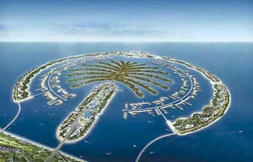 2、人造棕櫚島:從高空俯瞰迪拜(游客自費(fèi)乘坐直升飛機(jī)),依稀可見兩棵巨大的棕櫚 樹漂浮在蔚藍(lán)色的海面上,仔細(xì)辨認(rèn),棕櫚樹竟是由一些錯(cuò)落有致、大大小小的島嶼 組成的世界上最大的人工島;