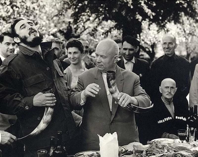 1962年古巴導(dǎo)彈危機,翌年古巴領(lǐng)導(dǎo)人卡斯特羅訪問蘇聯(lián),時任蘇聯(lián)領(lǐng)導(dǎo)人赫魯曉夫在格魯吉亞用獸角杯招待客人。