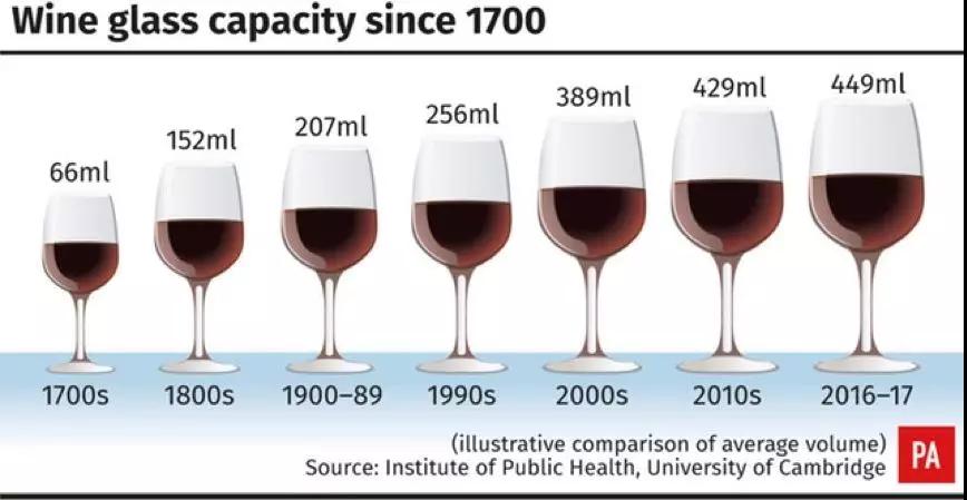 劍橋大學(xué)的一項研究發(fā)現(xiàn),在過去300年里,酒杯的容量增加了7倍,而且在最近20年里增幅最大。