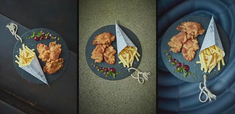 當(dāng)你發(fā)現(xiàn)背景中存在大量線條(或定向的紋路)時,不妨嘗試改變一下食物擺放和拍攝的角度,讓背景的線條變傾斜,或許會有意外之喜。