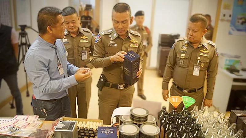今年11月,有“假酒之王”稱號的63歲馬來西亞男子Chan Fat Yat在曼谷一停車場與客戶交貨時被捕。警方在現(xiàn)場繳獲了大量假冒洋酒、制假工具以及包裝盒,其中包括26瓶假冒尊尼獲加威士忌、100個尊尼獲加威士忌空瓶、252個偽造海關(guān)印章、以及眾多品牌烈酒與葡萄酒(尊尼獲加、芝華士、奔富Bin 389等)的酒標(biāo)等。
