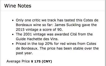Chateau Lafitte酒莊位于位于法國C?tes de Bordeaux產(chǎn)區(qū),由Raymond Lafitte創(chuàng)建于1763年。在Wine Searcher上的國際均價為175元,James Suckling曾為其2015年份的葡萄酒打了90分。