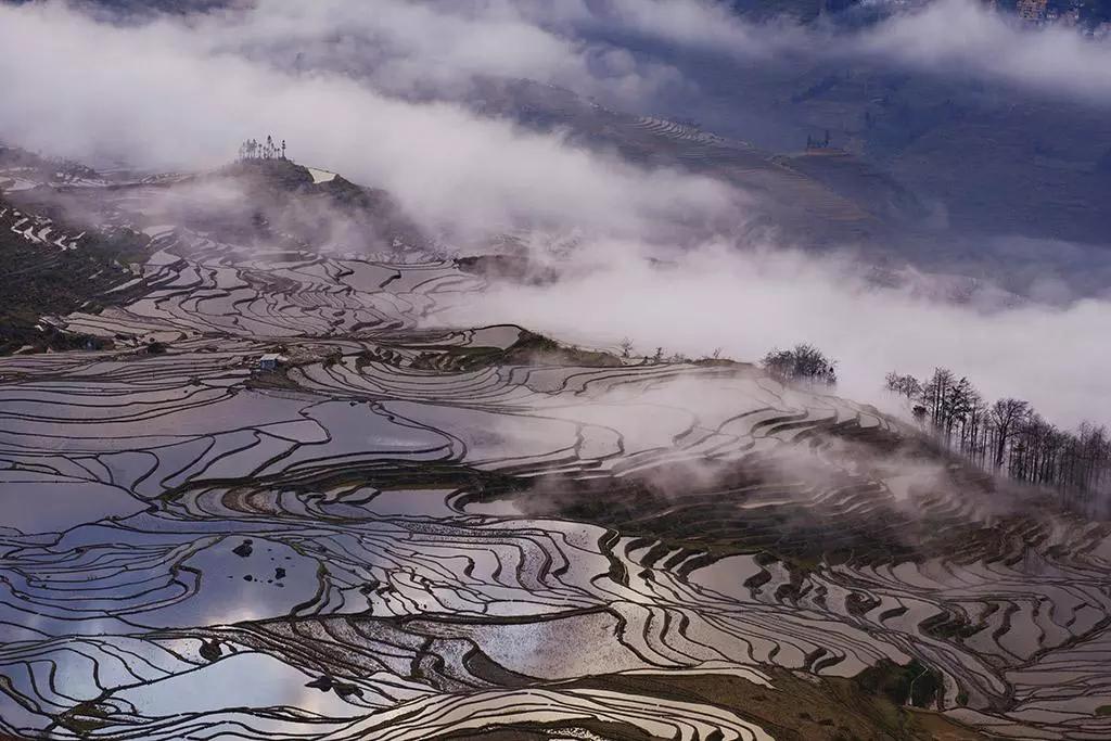 隨著朝陽(yáng)逐漸爬上藍(lán)天,梯田中濃濃的水汽也慢慢化開(kāi),像是一滴白滴入了金的底色,在這精致的春景中一點(diǎn)點(diǎn)地蔓延開(kāi)來(lái),飄飄欲仙,美如仙境;