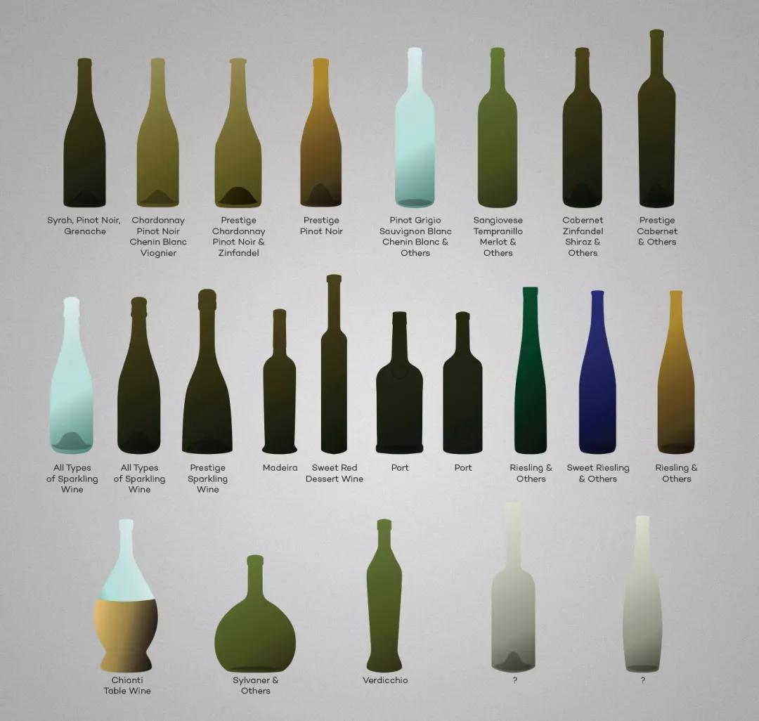 在這個統(tǒng)一的設(shè)計理念下,不同產(chǎn)區(qū)的不同瓶形,有一些是實用的區(qū)別——比如香檳格外厚重堅固的瓶子是因為瓶里壓力高達6個大氣壓。大部分其實都是因為傳統(tǒng)——當(dāng)初設(shè)計瓶子時就是這個形狀,沒有什么理由。后來也再沒改過。
