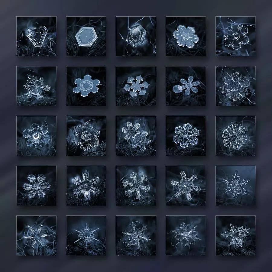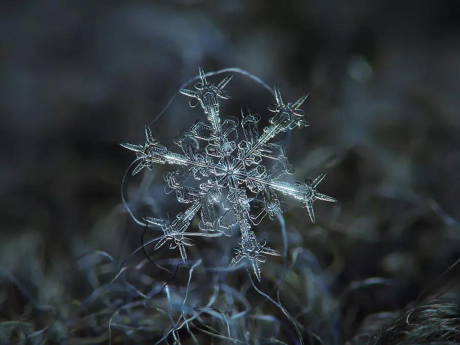 經(jīng)過多次嘗試后,克拉托夫最后采用了兩種辦法拍攝,一種是讓雪花落在深色的羊毛織物上,混合著渾濁天空下的自然光拍攝;另一種是使用 LED 燈作為輔助工具,逆光拍攝宛若水晶一般的雪花。