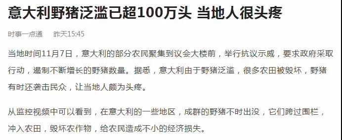 意大利的農民聚集到議會門前,要求政府采取措施,遏制已泛濫超百萬頭的野豬群。當地野豬十分霸道:它們毀壞農田,襲擊民眾,連種族的天敵——狼都不敢輕易接近,每年給意大利農民造成的直接經濟損失超過1億歐元。