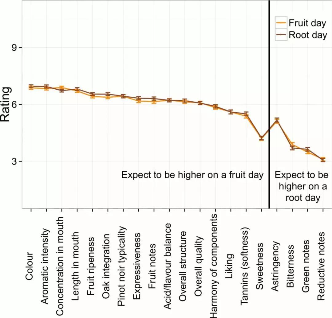 這還沒完,更有意思的是,整個實驗里唯一表現(xiàn)出具有統(tǒng)計學意義差異的不是根日與果日之間,而是同樣的酒款在兩次根日之間、兩次果日之間表現(xiàn)出的顯著差異。