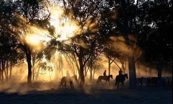 在逆光的樹林里面,牛,馬,羊,就是一個(gè)點(diǎn)