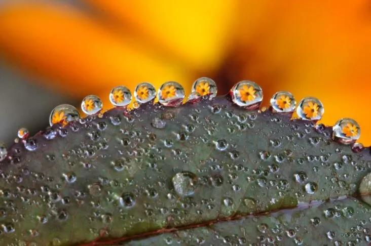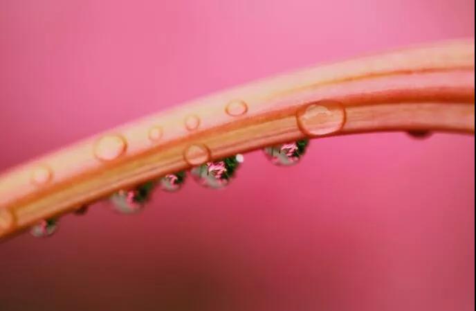 還有一種思路就是如果有針筒,也可以在這種樹(shù)葉上去噴,那么這個(gè)水滴呢,盡量噴的大小相同,然后,在背景后面再放一朵花,在水滴里面它就會(huì)有花朵的這種形態(tài),那么這個(gè)微距呢是平時(shí)最多人拍的。