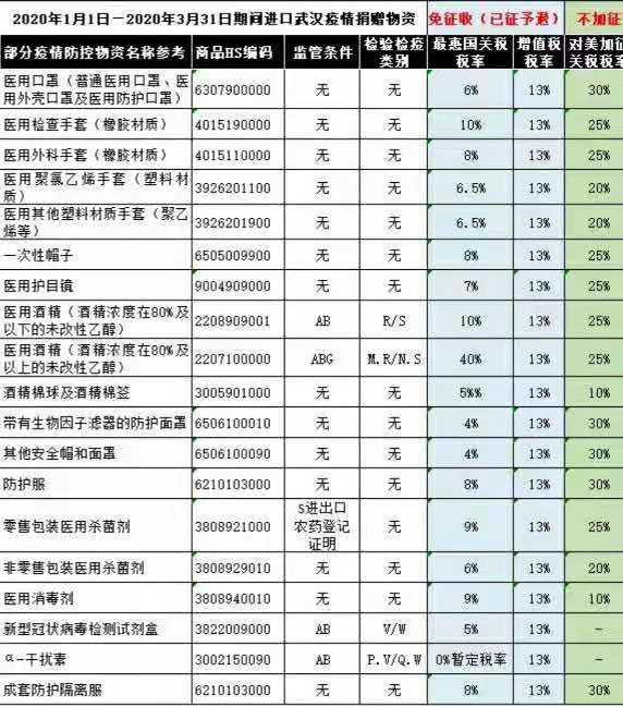 5、進(jìn)口且原產(chǎn)于美國的物資,不實(shí)施對(duì)美加征關(guān)稅措施,已加征稅款予以退還(2020.1.1-2020.3.31)。簡(jiǎn)而言之,就是海關(guān)不僅為疫情物資開放綠色清關(guān)通道,還免所有進(jìn)口稅費(fèi)(企業(yè)自用或用于銷售的防護(hù)物資不適用“捐贈(zèng)物資”監(jiān)管方式,依然要繳納相關(guān)稅費(fèi))。