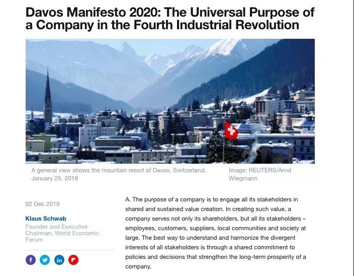 剛剛發(fā)布的2020年《達(dá)沃斯宣言》寫道:企業(yè)不僅要為股東,也要為所有利益相關(guān)者(員工、客戶、供應(yīng)商、當(dāng)?shù)厣鐓^(qū)和整個(gè)社會(huì))服務(wù)。在細(xì)則中,“為客戶服務(wù)”是第一條,“為股東提供投資回報(bào)”則被放在最后一條。