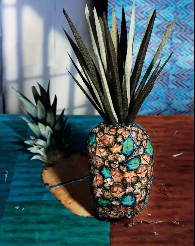 組成“靜物”的絕大部分食物都是水果,甚至還有用紙殼打印的假菠蘿——丹尼爾·戈登(Daniel Gordon) 的《菠蘿和影子》 (Pineapple and Shadow, 2011),如果僅以它們作為食物,好像可以直接加入果食主義者(Fruitarian)的行列了。直到這一面面深藍背景展墻的水果盛宴快要結(jié)束之時,才出現(xiàn)了少許葷食。