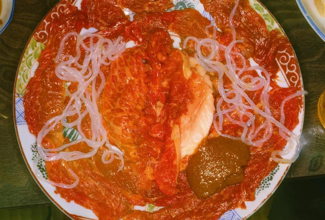 日本攝影家荒木經(jīng)惟有一組名為《盛宴》(The Banquet, 1993)的作品,選取四張,模樣都有點張揚,其中一盤最為生猛,能讓一路看過來已經(jīng)懷念肉食的觀眾趕緊轉(zhuǎn)頭再看幾眼水果。當今的食物照片多數(shù)用于傳播和分享,絕大多數(shù)都以精致面目示人,這樣一組照片通過近乎冒犯的方式提醒觀眾:不僅食物本身,就連食物的呈現(xiàn)其實都是多樣的。
