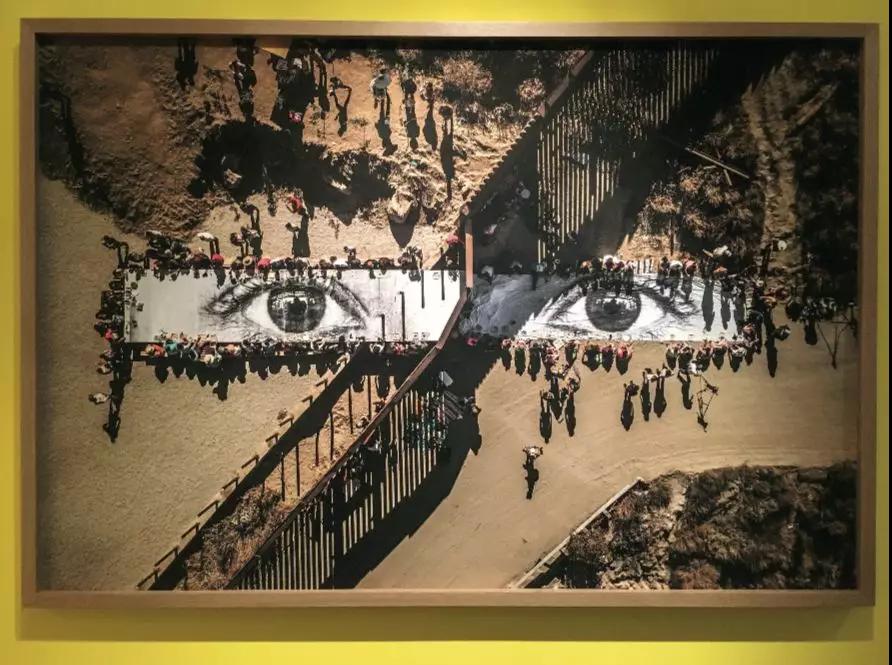 這種平靜馬上被接下來的作品打破。法國藝術(shù)家JR在 2017 年拍攝于美國與墨西哥邊境的作品《移民,梅拉,穿越邊境的野餐》(Migrants, Mayra, Picnic Across the Border)直接以一雙眼睛和觀眾對視。照片從空中俯拍,應該由無人機完成,細看之下,這雙眼睛印在一張有兩種形態(tài)的餐桌上,一種是堅硬的桌子,另一種是柔軟的桌布。桌子和桌布并未真正相接,但因為視覺和情感上的慣性,把它們看作是一張穿越了邊境的餐桌。與這張餐桌對視,有那么一刻,可以忽視墻的阻隔,只看見這些同吃同喝的人們。