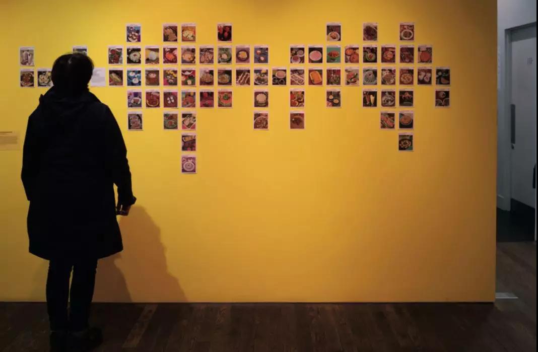 《減肥者食譜卡片》(Weight Watchers Recipe Cards, 1974)幾乎鋪滿了一整面墻。這面墻也最受觀眾歡迎,明黃底色之下,滿墻各式各樣的食物,引發(fā)熱烈討論,時而歡聲笑語,熱鬧若市,引得剛?cè)雸龅挠^眾側(cè)目。粗看之下,這就是一墻食物,細細看來往往都要吸幾口涼氣:這些食物在外形上都有超越常規(guī)審美的模樣,大多濃厚濁膩,用“黑暗料理”形容不為過,有的甚至算得上“邪典料理”……目的何在?——《減肥者食譜卡片》。理論上,減肥需要控制飲食并加強鍛煉,控制飲食的方法不少,遏制食欲無疑能從源頭上解決問題。于是,這些有助于遏制食欲的小卡片應運而生,可謂“一本正經(jīng)胡說八道”,難怪觀眾會邊看邊笑。
