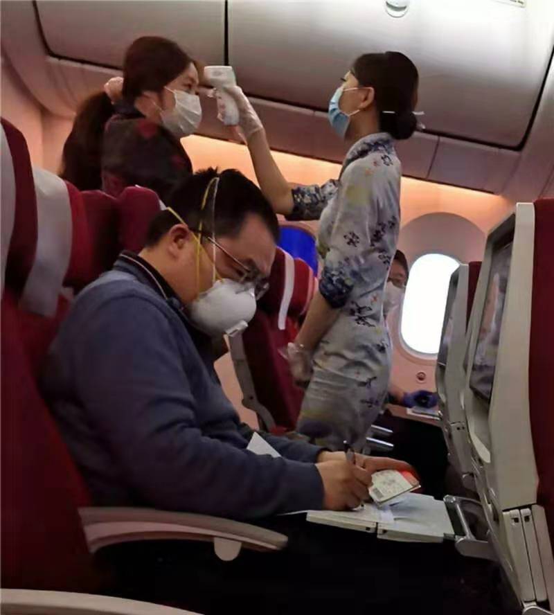 2月1日,在海南航空公司的國際航班上,機(jī)組人員向旅客發(fā)放健康申報(bào)表,并進(jìn)行必要的健康檢測和消毒。中國民航嚴(yán)格有序的措施,確保國際間人員往來和目的地國家的健康安全。