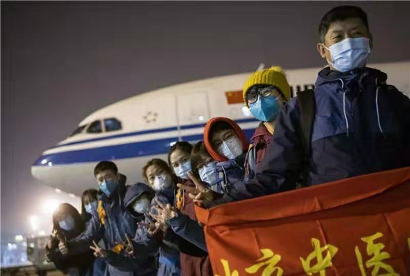 1月27日18時(shí)許,首都國際機(jī)場,北京市屬醫(yī)院援武漢醫(yī)療隊(duì)隊(duì)員合影。當(dāng)日,這支醫(yī)療隊(duì)乘坐國航包機(jī)奔赴武漢,隊(duì)員136人全部來自北京市各三甲醫(yī)院。隨同醫(yī)療團(tuán)隊(duì)一起登機(jī)的,還有武漢急需的醫(yī)療用品。