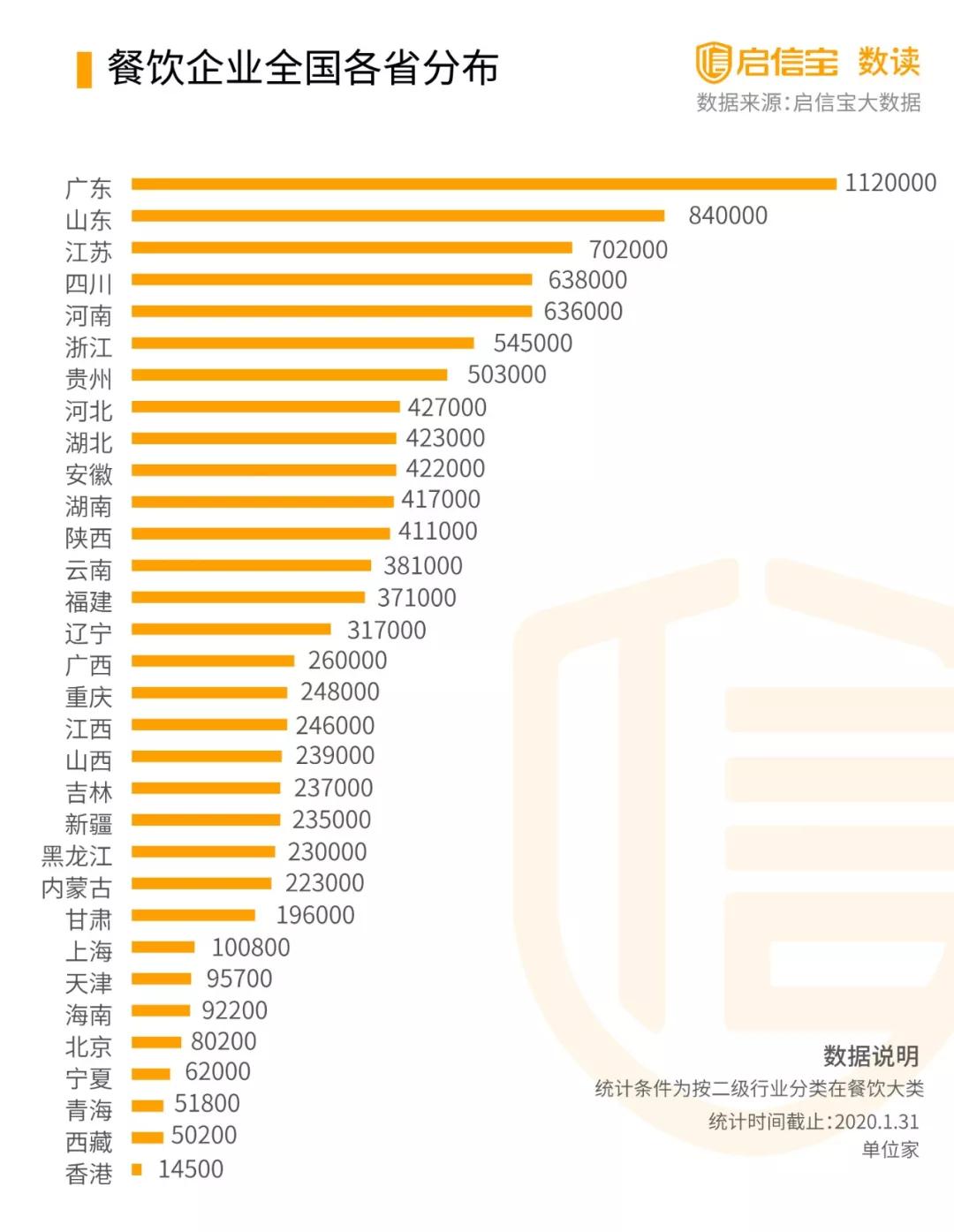 根據(jù)啟信寶數(shù)據(jù)統(tǒng)計(jì),全國共有11114300家有餐飲業(yè)務(wù)的企業(yè),其中廣東、山東、江蘇分別數(shù)量為前三,可能損失會(huì)相對(duì)較大。
