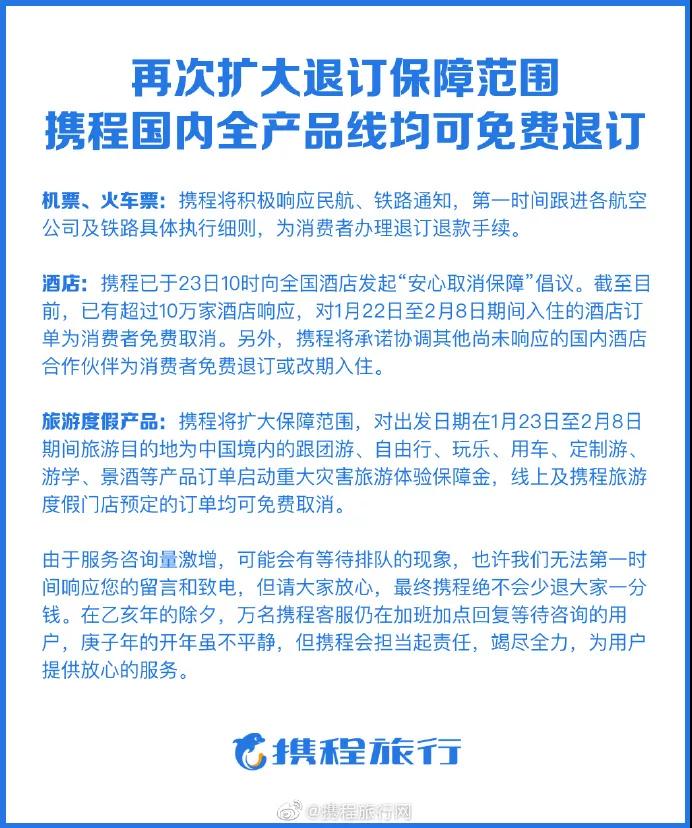 根據(jù)攜程1月31日晚間發(fā)布的“春運(yùn)退訂大數(shù)據(jù)”顯示,疫情發(fā)生以來,截至1月30日,攜程客服收到的退改量為數(shù)百萬單春節(jié)旅游訂單,客戶全球跟團(tuán)、半自助和定制游的訂單損失負(fù)擔(dān)至2月29日前。