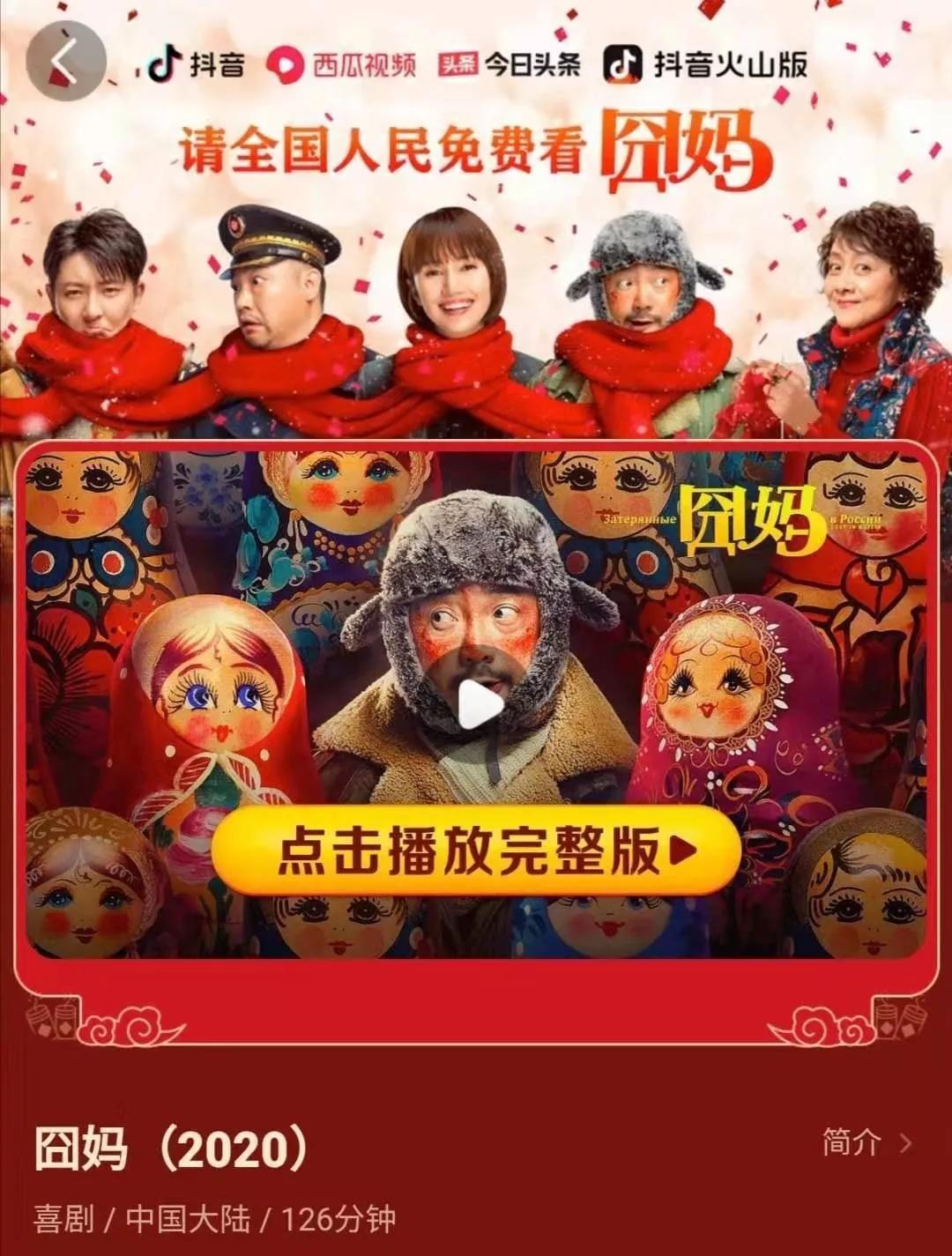 1月28日,字節(jié)跳動(dòng)對(duì)外宣布,截至1月27日零時(shí),電影《囧媽》在頭條系四大平臺(tái)(抖音、西瓜視頻、今日頭條、抖音火山版)及智能電視鮮時(shí)光三日總播放量超過6億,總觀看人次1.8億。統(tǒng)計(jì)顯示,2019年整個(gè)春節(jié)檔全部影片前三日的觀影人次為7378.1萬。