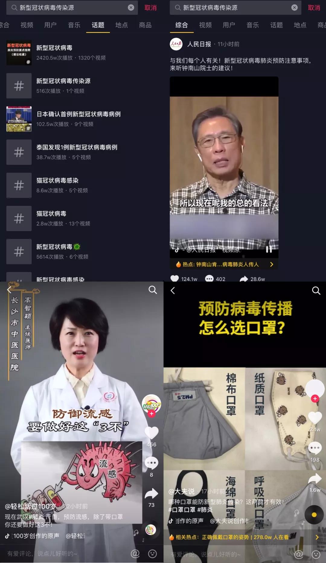 這一次的疫情趕上春節(jié),也正好是各大短視頻平臺(tái)火熱營銷的時(shí)機(jī),加上春節(jié)營銷的一層因素,抖音快手也能在疫情期間,抓住國民注意力流量,展現(xiàn)出作為內(nèi)容平臺(tái)的媒體與社會(huì)價(jià)值。 在快手抖音的熱搜上,“冠狀病毒肺炎”相關(guān)的話題都位列其中,人民日?qǐng)?bào)發(fā)布的“鐘南山院士建議”、“習(xí)近平重要指示”,央視網(wǎng)發(fā)布的“冠狀病毒最新確診病例”等短視頻,播放量都在100萬以上,也都得到用戶極大的關(guān)注與討論熱度。