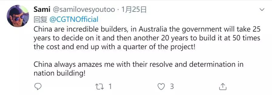 “中國真是令人難以置信的建設(shè)者,在澳大利亞,政府需要25年時(shí)間來做出決定,然后再用20年時(shí)間來建造,成本會(huì)是50倍,且最后僅以項(xiàng)目的四分之一完工!中國在國家建設(shè)方面的決心和果斷總是讓我吃驚!”
