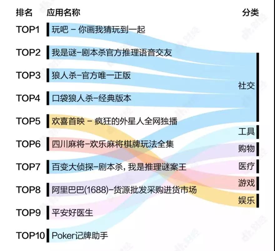 根據(jù)七麥數(shù)據(jù),近七天下載量上升最多的1000個(gè)APP中有超過40%是游戲類應(yīng)用。其中排名前四的是玩吧、我是謎、狼人殺、口袋狼人殺四個(gè)社交類游戲APP。