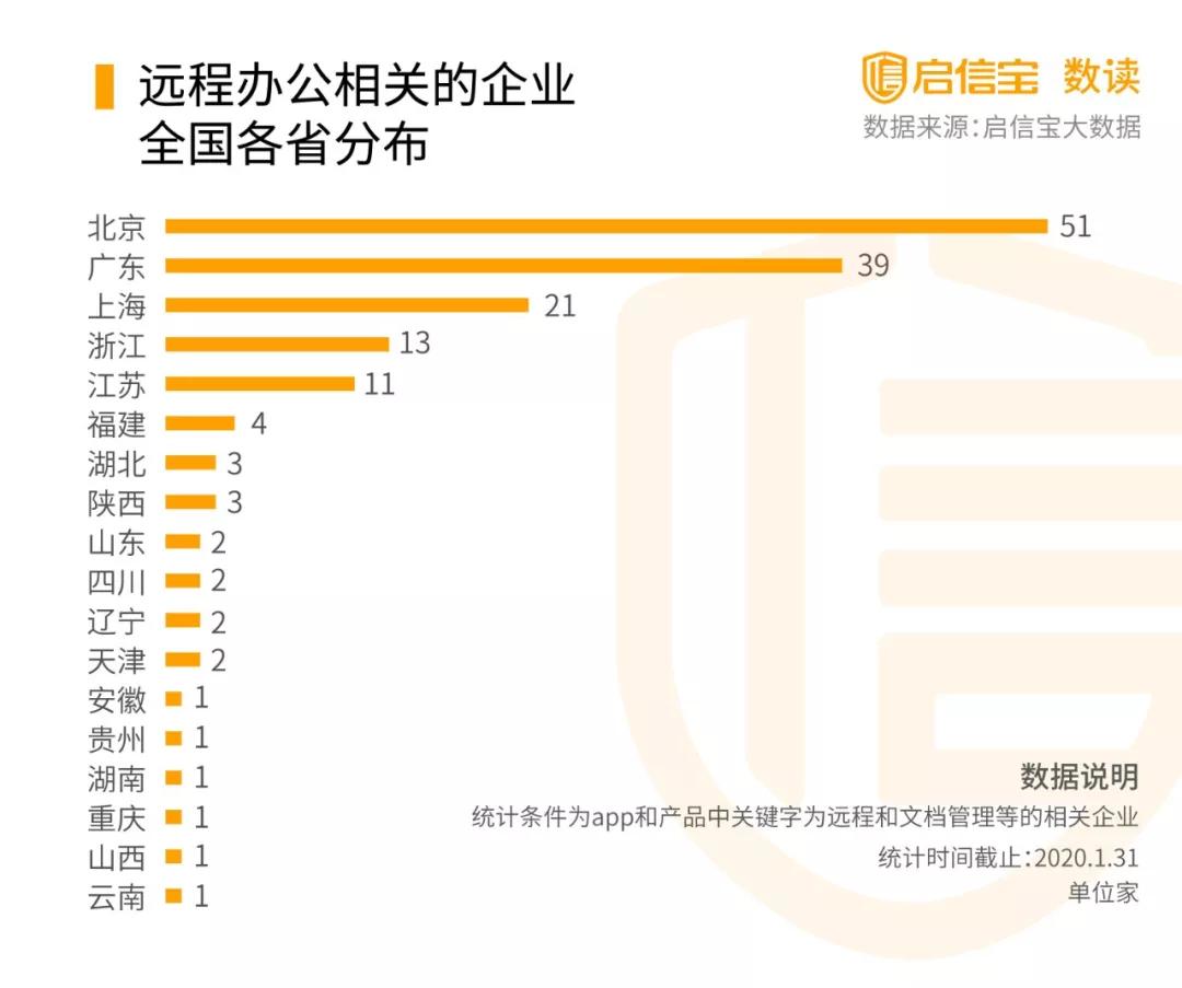 根據(jù)啟信寶數(shù)據(jù)統(tǒng)計(jì),全國共有159家有遠(yuǎn)程辦公的企業(yè),其中北京、廣東、上海分別數(shù)量為前三,可能受益會(huì)相對(duì)較大。