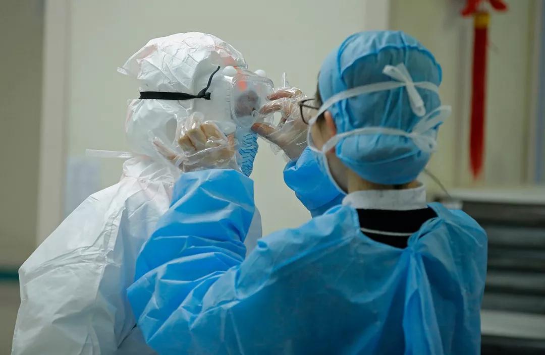 由于防護服一人穿起來很麻煩,一位護士讓別人幫忙調(diào)整目鏡。