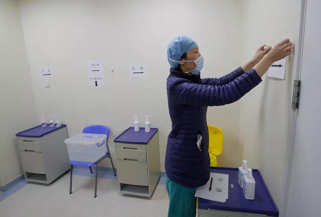 武漢協(xié)和醫(yī)院西院新冠病房開始投用前一小時,醫(yī)護人員在半污染區(qū)做最后的準(zhǔn)備。