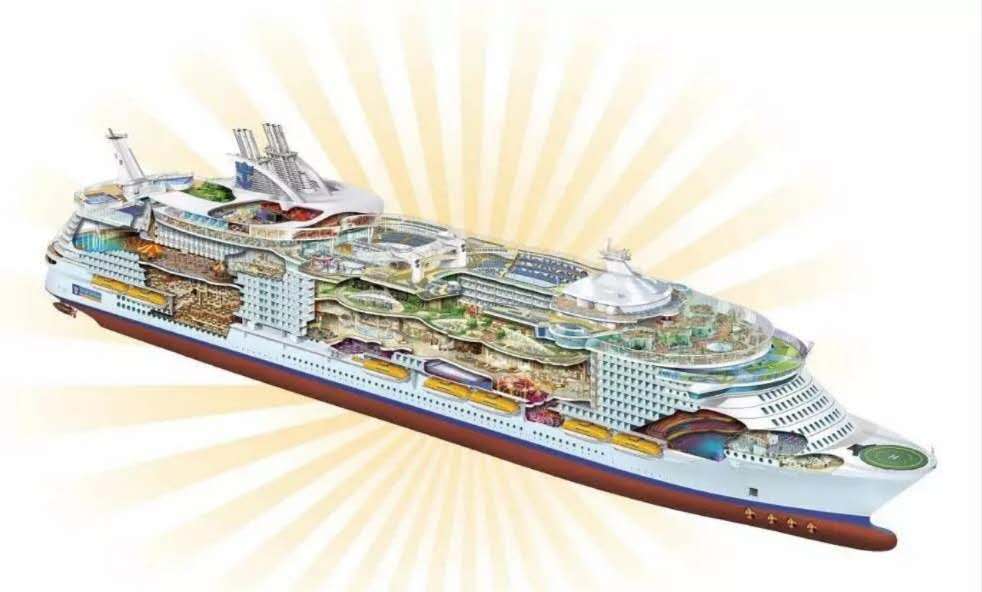 從總噸位來說,現(xiàn)代世界上最大郵輪無疑是皇家加勒比郵輪公司總噸位超過22萬綠洲級(jí)系列郵輪。