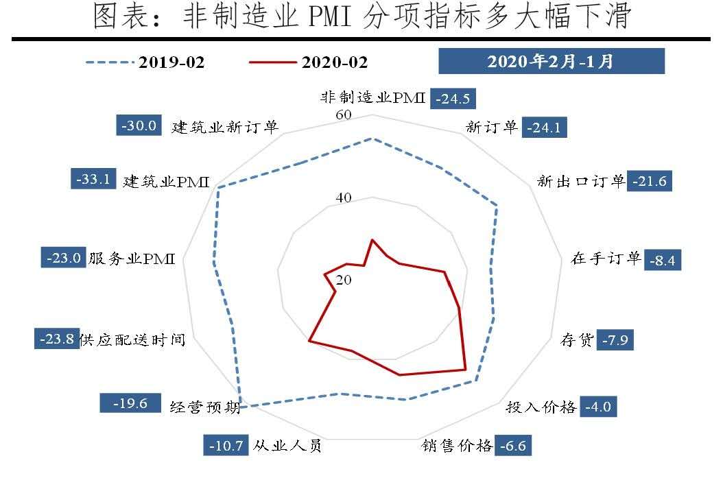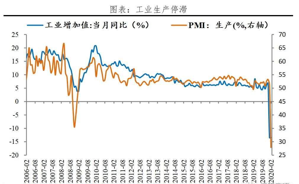 2月制造業(yè)PMI指數(shù)為35.7%,較上月大幅下滑14.3個百分點(diǎn),低于2008年11月全球金融危機(jī)時的38.8%。分項(xiàng)來看:1)生產(chǎn)放緩。2月PMI生產(chǎn)指數(shù)為27.8%,較上月大幅下滑23.5個百分點(diǎn),與疫情沖擊下企業(yè)延遲復(fù)工、生產(chǎn)停滯有關(guān)。2)內(nèi)外需求疲弱。2月新訂單和新出口訂單指數(shù)分別為29.3%和28.7%,分別較上月大幅下滑22.1和20.0個百分點(diǎn)。3)價格指數(shù)下滑,企業(yè)虧損和通縮風(fēng)險加大。2月原材料和出廠價格指數(shù)分別為51.4%和44.3%,較上月分別下滑2.4和4.7個百分點(diǎn)。出廠價格和原材料價格指數(shù)差值擴(kuò)大,中下游企業(yè)盈利壓力加大。4)采購量和經(jīng)營預(yù)期指數(shù)大幅下滑,原材料庫存大降、產(chǎn)成品庫存積壓。2月原材料庫存指數(shù)較上月下滑13.2個百分點(diǎn),后期有較強(qiáng)補(bǔ)庫存需求;產(chǎn)成品庫存指數(shù)較上月上升0.1個百分點(diǎn),反映疫情期間物流堵塞、消費(fèi)放緩導(dǎo)致的庫存積壓。5)大中小型企業(yè)PMI均大幅下滑,中小企業(yè)受沖擊更大。2月大中小型企業(yè)PMI指數(shù)分別為36.3%、35.5%和34.1%,較上月分別下滑14.1、14.6和14.5個百分點(diǎn)。