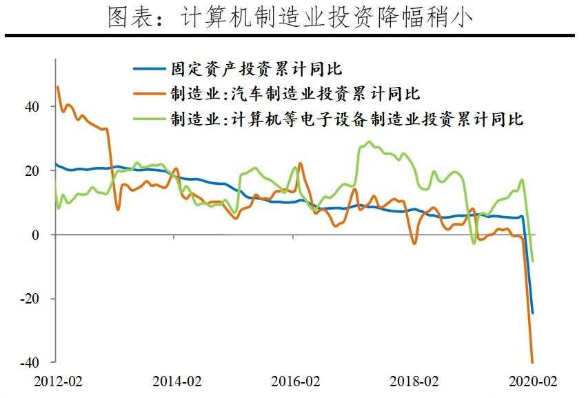 1-2月制造業(yè)投資累計同比-31.5%,較去年12月當(dāng)月同比下滑40.7個百分點(diǎn),創(chuàng)歷史新低。分行業(yè)看,中游裝備加工類行業(yè)和下游消費(fèi)品類行業(yè)是主要拖累,農(nóng)副食品(1-2月累計同比-38.9%)、食品(-35.1%)、紡織(-44.0%)、金屬(-38.1%)、通用設(shè)備(-40.1%)、汽車(-41.0%)等行業(yè)投資下滑幅度大于制造業(yè)投資整體。高技術(shù)產(chǎn)業(yè)投資同比-17.9%,降幅低于整體6.6個百分點(diǎn),其中高技術(shù)制造業(yè)、高技術(shù)服務(wù)業(yè)投資分別為-16.5%、-20.8%。