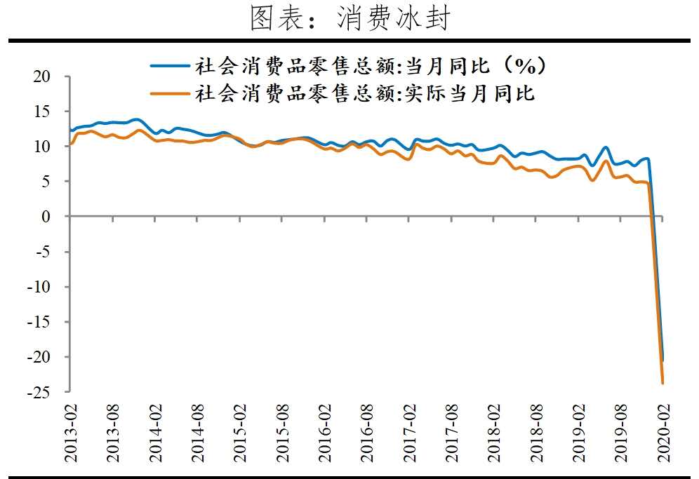 消費(fèi)冰凍,僅糧油食品、飲料、藥品等少數(shù)維持正增長。1-2月社會消費(fèi)品零售總額名義和實(shí)際增速分別為-20.5%和-23.7%,分別較去年12月大幅下滑28.5和28.2個百分點(diǎn),均創(chuàng)1995年公開數(shù)據(jù)以來的歷史新低;除汽車外社會消費(fèi)品零售額同比-18.9%,下滑19.7個百分點(diǎn)。從消費(fèi)品類看,餐飲消費(fèi)接近腰斬,汽車、石油及制品和地產(chǎn)相關(guān)消費(fèi)品大幅下滑,糧油食品類消費(fèi)保持增長。1)1-2月餐飲和商品消費(fèi)同比分別為-43.1%和-17.6%,分別較12月下滑52.2和25.5個百分點(diǎn)。2)因出行需求大幅減少,汽車、石油及制品消費(fèi)同比分別為-37.0%、-26.2%,分別下滑38.8和30.2個百分點(diǎn)。3)家具、家用電器和建筑裝潢材料消費(fèi)增速分別為-33.5%、-30%和-30.5%,分別下滑35.3、32.7和31.1個百分點(diǎn)。4)升級類消費(fèi)品珠寶、服裝和化妝品類消費(fèi)同比分別為-41.1%、-30.9%和-14.1%,分別下滑44.8、32.8和26個百分點(diǎn)。5)實(shí)物商品網(wǎng)上零售額增速3%,較2019年下滑16.5個百分點(diǎn)。其中,吃、穿、用類增速分別為26.4%、-18.1%、7.5%,分別下滑4.5、33.5和12.3個百分點(diǎn);必需消費(fèi)品糧油食品類消費(fèi)增速9.7%,與12月持平。從消費(fèi)區(qū)域看,城鎮(zhèn)和農(nóng)村消費(fèi)增速分別為-20.7%和-19%,分別較12月下滑28.5和28.1個百分點(diǎn)。