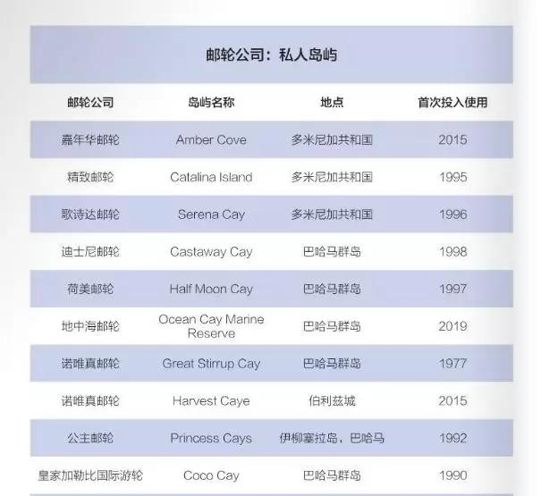 郵輪公司的私人島嶼幾家經(jīng)營(yíng)巴哈馬/加勒比海航線(xiàn)的郵輪公司都設(shè)有“私人島嶼沙灘日”行程。諾唯真郵輪在1977年購(gòu)買(mǎi)了一個(gè)此前為軍事哨所的島嶼,引領(lǐng)了郵輪公司購(gòu)買(mǎi)私屬島嶼的新趨勢(shì)。到目前為止,諾唯真已經(jīng)花費(fèi)數(shù)百萬(wàn)美元用于升級(jí)島上設(shè)施。