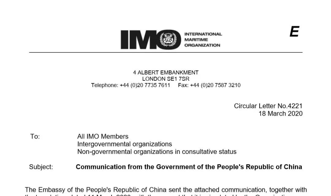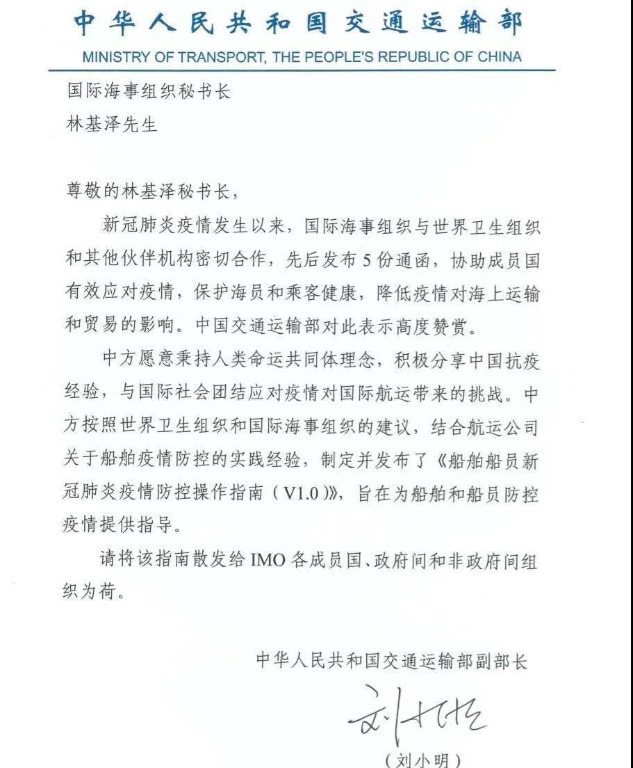 2020年3月18日,國(guó)際海事組織IMO發(fā)布Circular Letter No.4221,該通函件轉(zhuǎn)發(fā)了IMO秘書長(zhǎng)林基澤先生收到的中華人民共和國(guó)交通運(yùn)輸部劉小明副部長(zhǎng)3月11日發(fā)送的信函,信函后附《船舶船員新冠肺炎疫情防控操作指南(V1.0)》。IMO正式向174個(gè)成員國(guó)推薦由中國(guó)海事局編制的《船舶船員新冠肺炎疫情防控操作指南》,《指南》結(jié)合廣東海事局和航運(yùn)公司關(guān)于船舶疫情防控的實(shí)踐經(jīng)驗(yàn)制定,包括了船舶落實(shí)防控實(shí)施,加強(qiáng)船員個(gè)人防護(hù)等6個(gè)方面。
