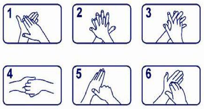使用肥皂或洗手液并用流動(dòng)水洗手,推薦以下洗手六步法:
