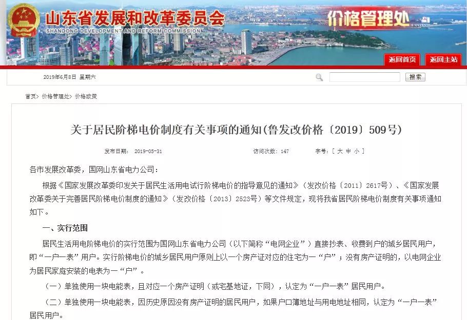 省發(fā)改委發(fā)布了《關(guān)于居民階梯電價(jià)制度有關(guān)事項(xiàng)的通知》(魯發(fā)改價(jià)格〔2019〕509號)
