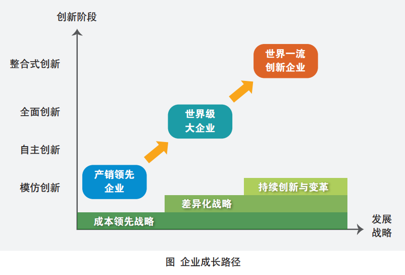 戰(zhàn)略選擇對(duì)于企業(yè)未來(lái)可以走到的位置有著決定性作用,企業(yè)不同成長(zhǎng)階段分別對(duì)應(yīng)不同的發(fā)展戰(zhàn)略。成本領(lǐng)先戰(zhàn)略和差異化戰(zhàn)略只能幫助企業(yè)成為大企業(yè),唯有不斷創(chuàng)新才能幫助企業(yè)成為世界一流創(chuàng)新企業(yè)。