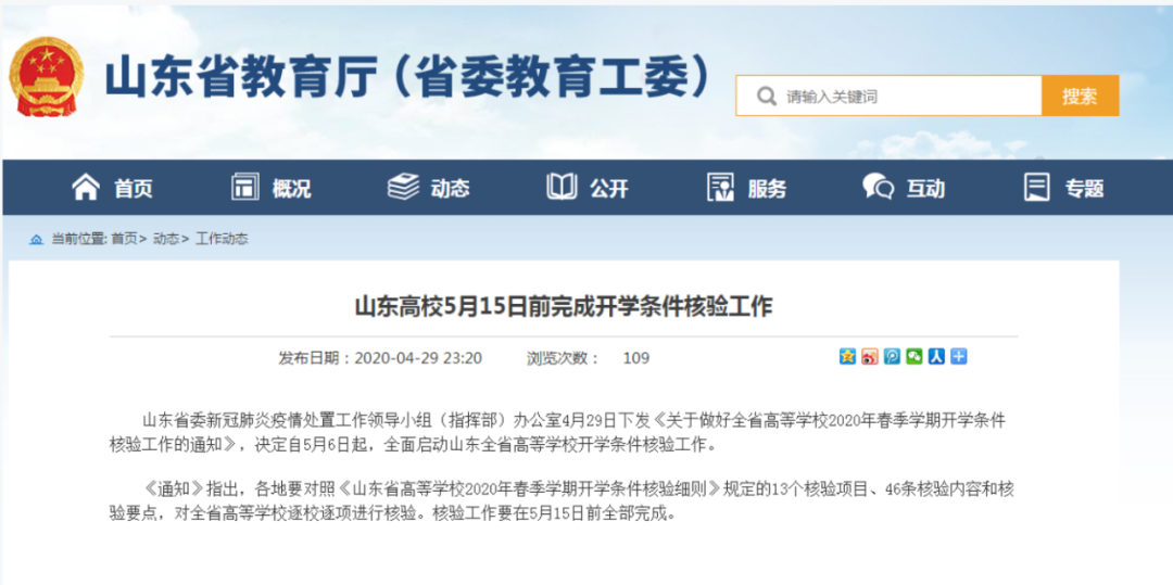據(jù)山東省教育廳4月29日消息,山東省委新冠肺炎疫情處置工作領(lǐng)導(dǎo)小組(指揮部)辦公室4月29日下發(fā)《關(guān)于做好全省高等學(xué)校2020年春季學(xué)期開學(xué)條件核驗工作的通知》,決定自5月6日起,全面啟動山東全省高等學(xué)校開學(xué)條件核驗工作。