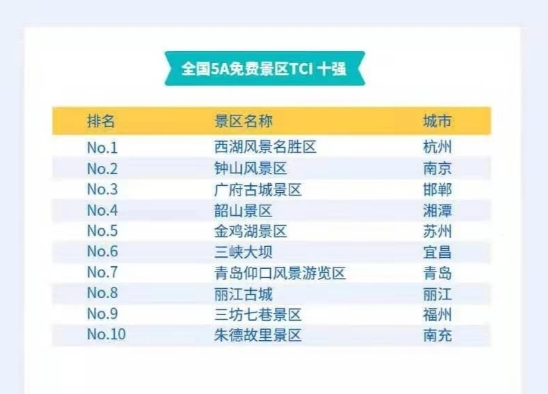 報(bào)告還顯示,頤和園、天壇公園、廣州長(zhǎng)隆旅游度假區(qū)、黃鶴樓、秦始皇兵馬俑博物館、故宮博物院、蕪湖方特旅游度假區(qū)、瘦西湖、大唐芙蓉園、華山風(fēng)景名勝區(qū)等亦位居全國(guó)5A收費(fèi)景區(qū)TCI榜單的前列;西湖風(fēng)景名勝區(qū)、中山陵景區(qū)、鐘山風(fēng)景區(qū)、廣府古城景區(qū)、韶山景區(qū)等位居全國(guó)5A免費(fèi)景區(qū)TCI的前列。