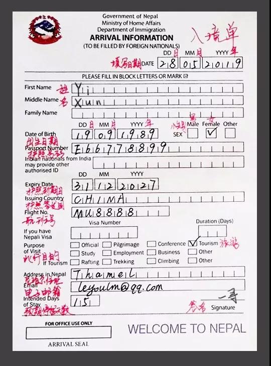 抵達(dá)加德滿都國(guó)際機(jī)場(chǎng),進(jìn)入航站大樓穿過(guò)走廊后,達(dá)到入境大廳。在桌子上,可以很容易找到入境卡。如果乘坐國(guó)內(nèi)航空公司飛機(jī)入境,飛機(jī)快抵達(dá)時(shí),空乘人員會(huì)給每位乘客分發(fā)一張入境卡,如果空乘沒(méi)有主動(dòng)給,自己可以在飛機(jī)上向空乘人員索要入境卡。入境卡是每個(gè)人都務(wù)必填寫(xiě)的,包括已辦理好簽證和準(zhǔn)備辦理落地簽的游客。