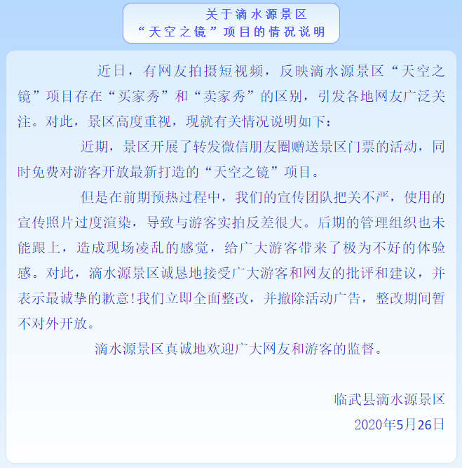 滴水源景區(qū)的“天空之鏡”就這樣成為另類“新晉網(wǎng)紅”,在網(wǎng)友嘲諷之下,景區(qū)不得不刊登道歉聲明: