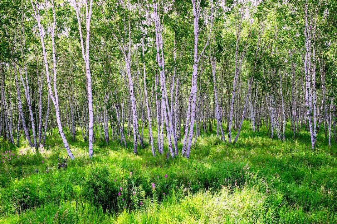 夏季的白樺林一片碧綠