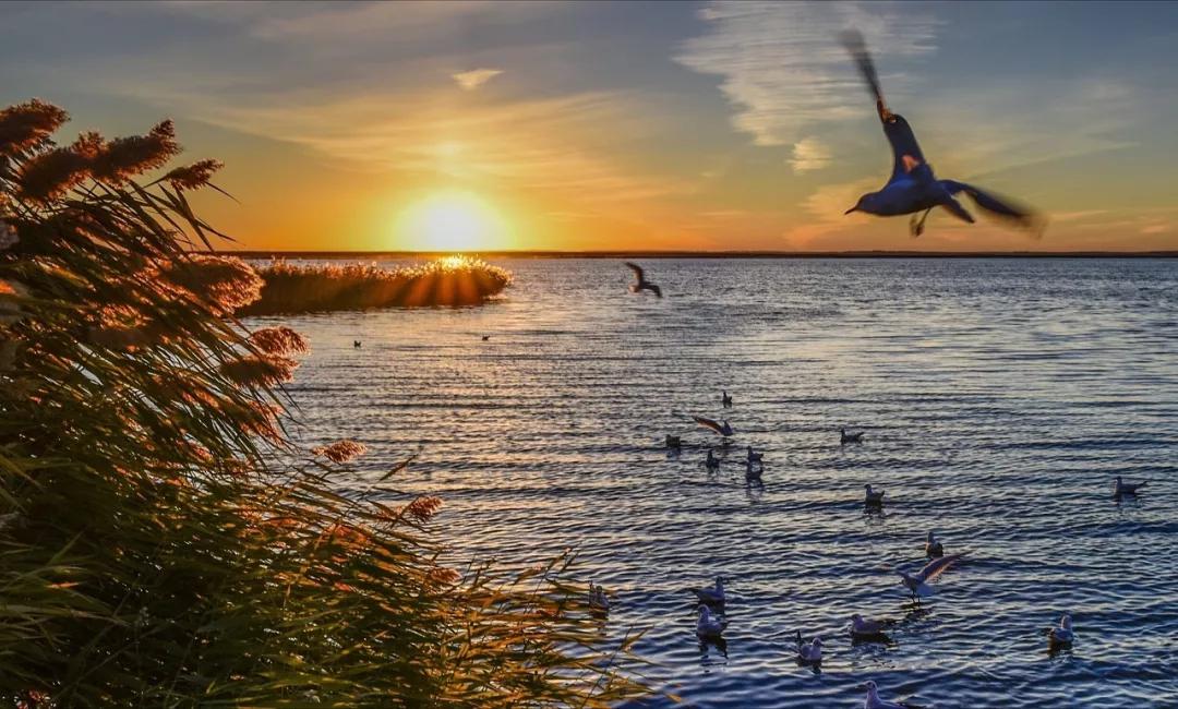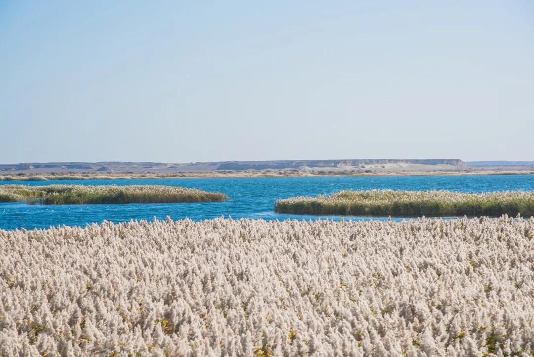湖面上碧波蕩漾,湖畔蘆葦叢生