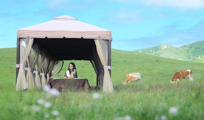 閉上眼睛,思緒飄向遙遠(yuǎn)的內(nèi)蒙壩上草原,在蒼茫的草原之上,精致的帷幔,浪漫的輕紗,香檳美酒,可口果盤,美味餐包,手抓羊肉……觥籌交錯(cuò)間的歡聲笑語一直縈繞在我心頭,回來之后依然會(huì)想起那個(gè)詩畫般的夢(mèng)境,久久不能忘懷。去壩上草原之前,我從來沒有想過可以在大草原感受一次高逼格冷餐會(huì),不再是水泥堆砌的四方格子,不再是吵吵嚷嚷的餐廳,一同舉杯,敬藍(lán)天白云,敬蒼茫草原,敬身邊這些可愛的人兒。