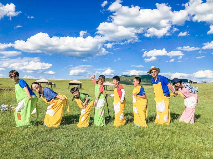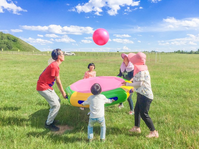四方綠茵場(chǎng),看不到邊際,望不到觀眾席;趣味草原運(yùn)動(dòng)會(huì),滑沙、拔河、袋鼠跳、鴻運(yùn)彩球、碰碰球……我沒想到,在沒有圍欄的草原踢球是這樣的酣暢淋漓;我沒有想到,在草原上放風(fēng)箏只能感嘆線不夠長;我沒想到,在草原還能玩這么多游樂項(xiàng)目。這里簡直就是一個(gè)草原迪士尼,兒童的天堂樂園,甚至連大人也能在這里找回童年的樂趣。