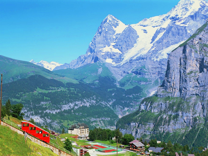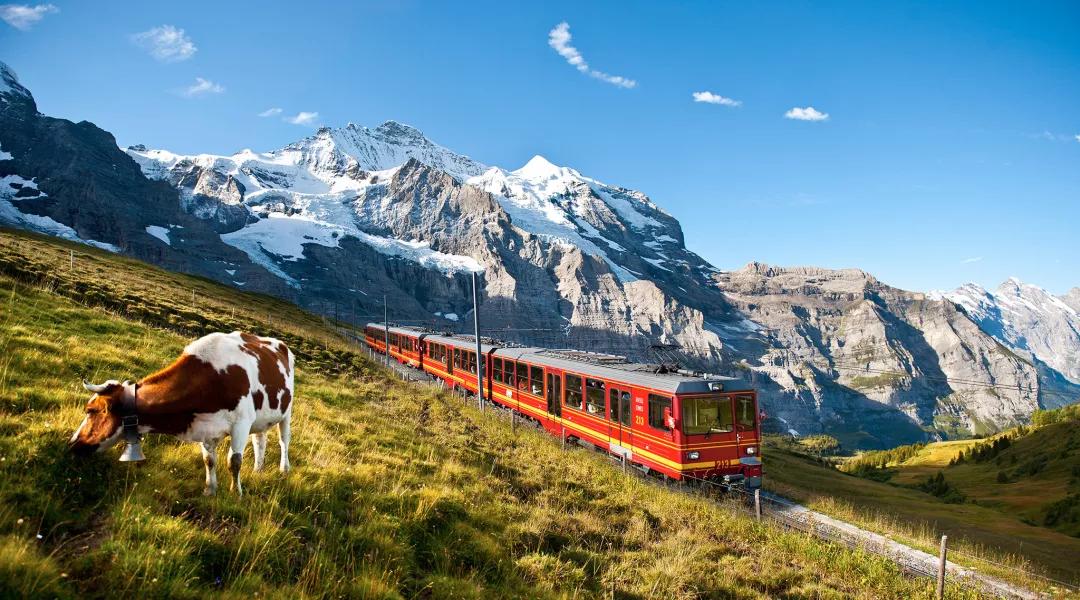 少女峰是瑞士最為出名的山峰,從因特拉肯火車站搭乘前往少女峰的觀光火車就能到達(dá)這個(gè)歐洲之巔。紅色的火車穿梭在阿爾卑斯山之間,雪山、森林和野花迎面而來,兩側(cè)的風(fēng)景凈收眼底。