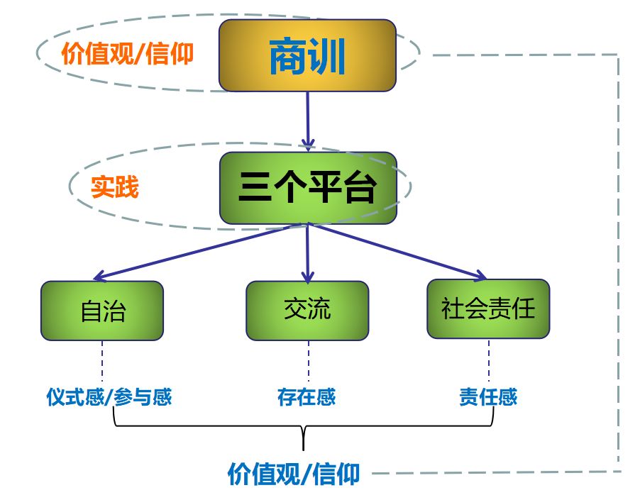 商訓(xùn)和商會(huì)“三個(gè)平臺(tái)”的關(guān)系,即價(jià)值觀和實(shí)踐層面是相互印證、相輔相成的關(guān)系。價(jià)值觀是靠“三個(gè)平臺(tái)”上的一系列工作為參與者帶來的儀式感、參與感、存在感、責(zé)任感等一系列“感覺”日積月累出來的,否則只能成為空洞的口號(hào)。